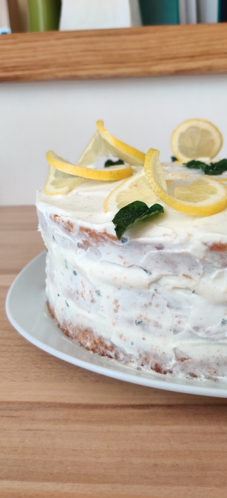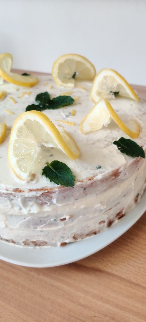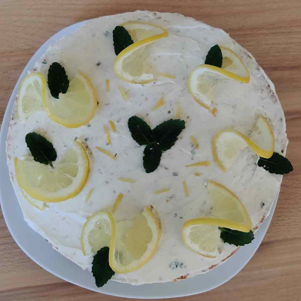 Nun kann die Torte zum Beispiel mit Zitronenscheiben und etwas Minze dekoriert werden.