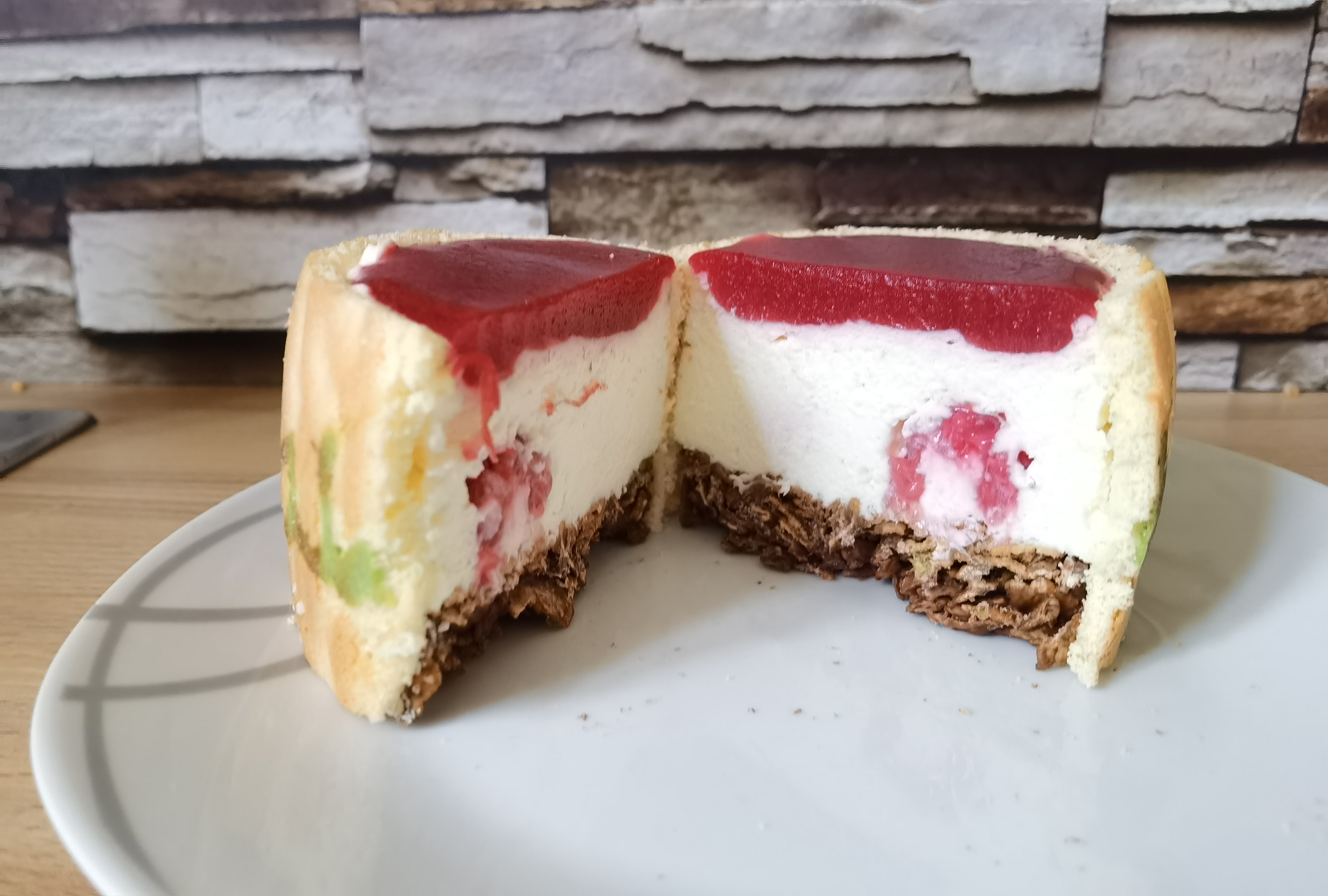 Jetzt wird der Biskuit in die passende Länge und Breite für die Form geschnitten. Die Form sollte ca. 6cm hoch sein und einen Durchmesser von 8cm haben. Diese Ringe werden mit einem Streifen Backpapier von innen ausgelegt. Danach können die zurechtgeschnittenen Teigstreifen in den Ring gelegt werden. Jetzt kann die Schoko-Cornflakes-Mischung in die Förmchen gegeben werden und flachgedrückt werden. Dann kann auch schon die Creme hineingefüllt werden. Zuerst nur bis zur Hälfte füllen, danach ca. 3 Stück Himbeeren hineindrücken und dann weiter mit Creme auffüllen. Jetzt das ganze im Kühlschrank kaltstellen.
