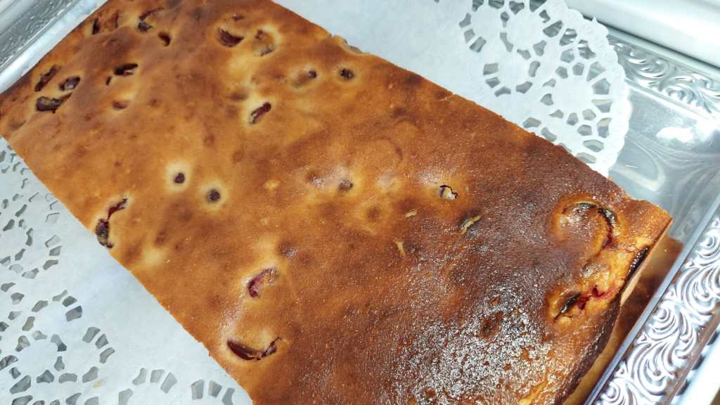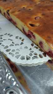Kuchen aus dem Rohr nehmen. Weichsel-Schneemasse darauf verstreichen. Kuchen backen, bis der Schaum leicht gebräunt ist. (ca. 10 Minuten)