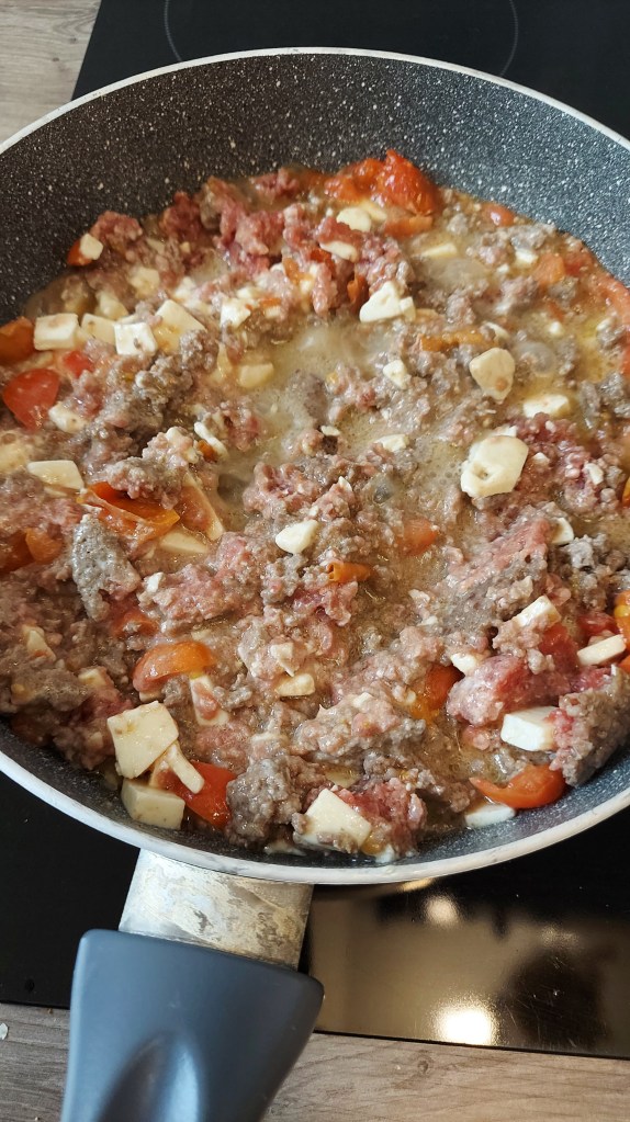 Während der Kürbis dahin gart das Faschierte mit Öl in der Pfanne anbraten. Paprika in kleine Stücke schneiden und untermischen. Mit Salz, Pfeffer und etwas Knoblauch abschmecken. Die Creme fraiche und den Fetakäse einrühren.