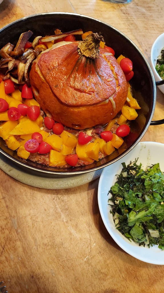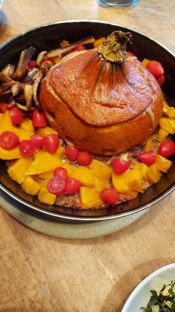 Wenn der Kürbis fertig gefüllt ist den Deckel draufsetzen und in eine hitzebeständige Pfanne stellen. Das restliche Faschierte gemeinsam mit den Kürbiswürfeln um den Kürbis verteilen.